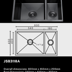 Elevate your kitchen’s form and function with the JSB3118A Luxury Double Bowl Sink — a contemporary design built for practical multitasking. Featuring two deep, same-size, spacious bowls, this sink is ideal for washing, rinsing, and food preparation simultaneously, bringing efficiency and elegance to your daily routine.